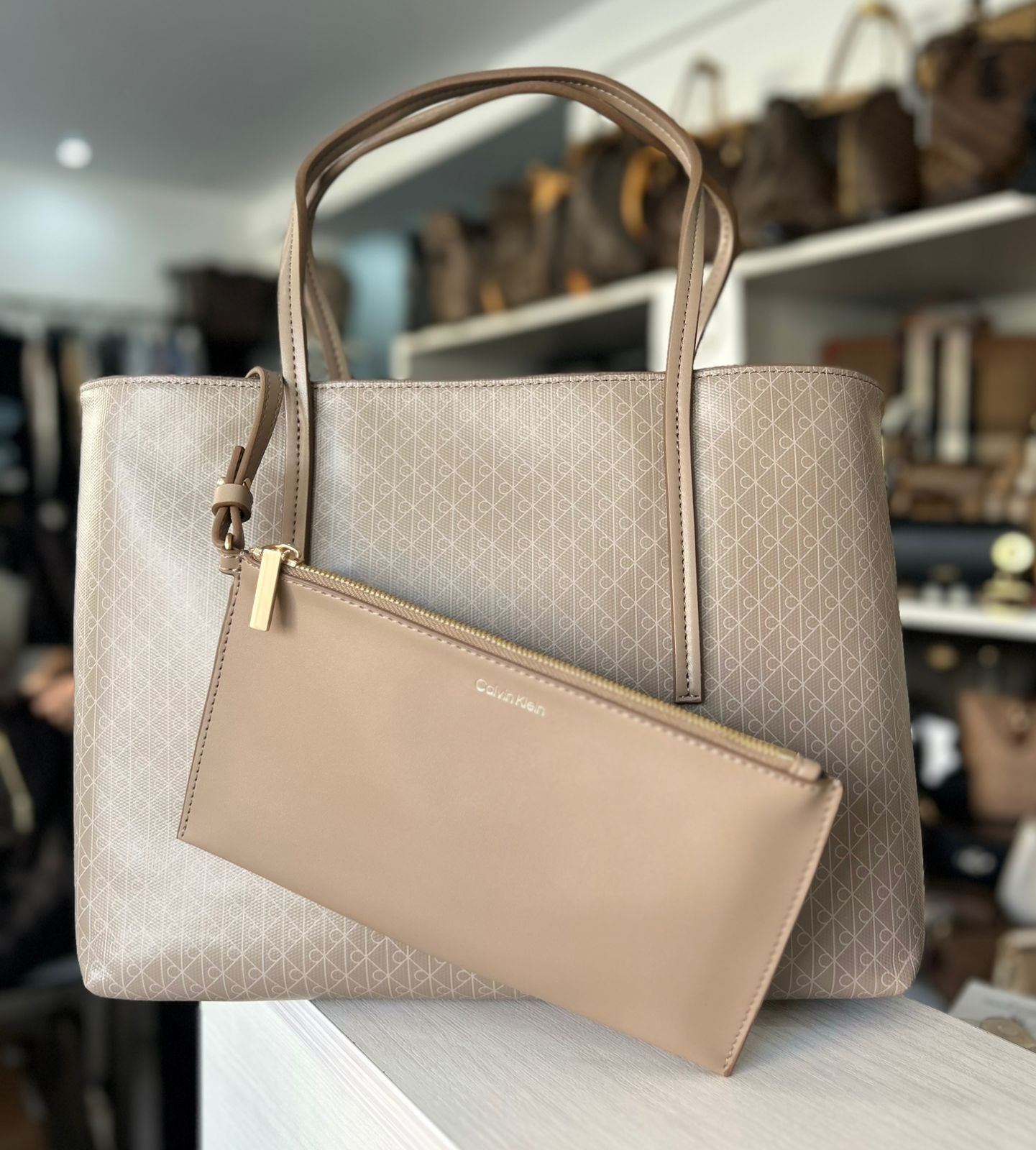 CK EMBLEM AOP SMALL TOTE DESERT TAUPE
